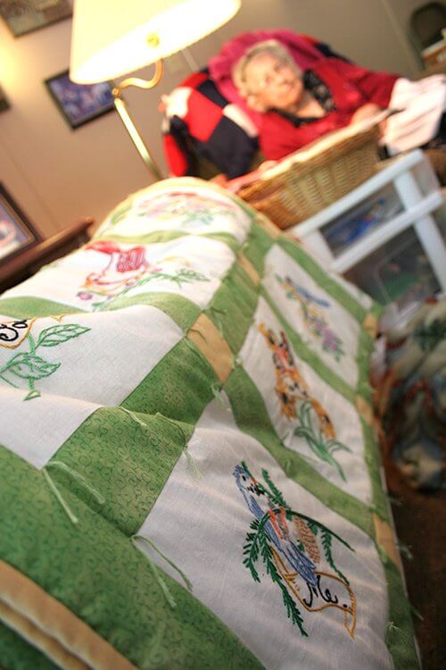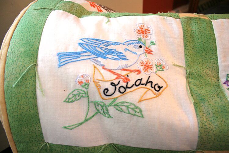 Iva’s room at St. Michael’s Assisted Living is stocked with fabric, needles and a rainbow of embroidery thread. On a simple wooden stand is a folded quilt encompassing all 50 state birds. Each was embroidered with a faithful eye to its natural coloring, from ruby red cardinals to the golden throats of western meadowlarks.