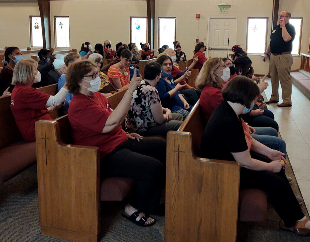 “Our first group showed up 30 minutes early. Our volunteers stepped up and helped people out of the vans,” Lisa said, “We told our volunteers to ‘adopt’ a group of 2-3 people as they came in, take them into the sanctuary, sit with them, talk with them, and worship with them. Our youngest volunteers handed out instruments.”