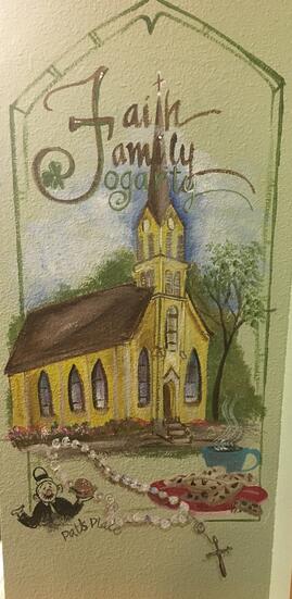 “Faith” is a word Grandma lives by. Our family jokes Grandma Carole prays enough for our entire family, and then some. She not only spends a great deal of time in prayer with her favorite rosary or at Our Lady of the Prairie Church (both pictured in the mural), but also lives out her faith each day in her actions. Grandma taught me and many others in Sunday School classes, sang in the church choir, distributed communion at The Lutheran Home: Belle Plaine and at people’s homes and volunteered serving school lunch. Before she started a family, Grandma was a nurse at New Prague Hospital. Not surprisingly, she chose this occupation to help and serve others. It was not until she met my grandpa, the outgoing and outspoken Irishman, that Grandma found a new way to share her faith.