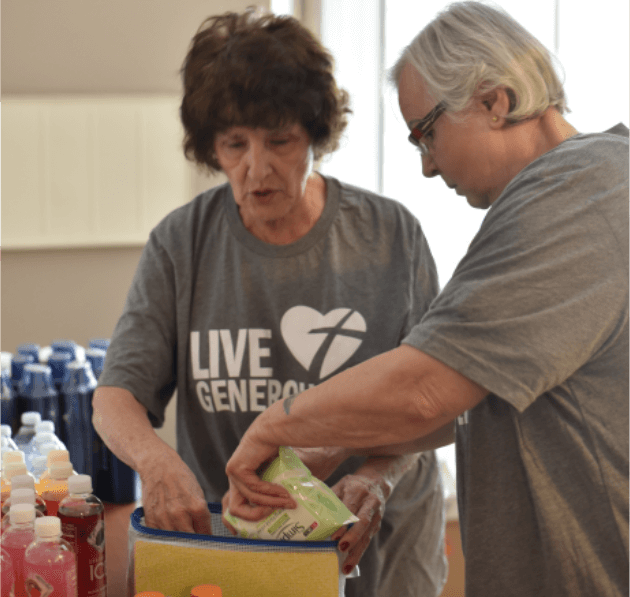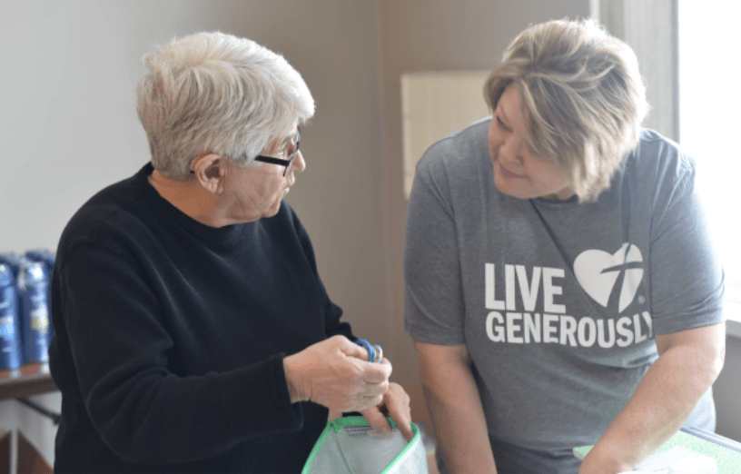The gifts for the JAF contain a variety of hygiene products and everyday items that many take for granted, including deodorant, pony tail holders, nail polish, socks and more. As the items arrived, Boessling residents organize the items to make filling the bags an easy process. In addition to the day-to-day items, the bags include candy and snack items. All the items are placed in a duffel bag. Upon delivery, Karen and her mother teach the kids how to iron their names on the bags. Residents at Hope received gift bags filled with goodies including body wash or lotion and a Thrivent Action Team t-shirt.